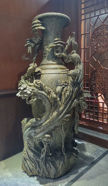 沉香花瓶:一对以松鹤延年、竹报平安为主题的沉香原木花瓶也是我喜欢的雕刻作品之一。这对花瓶用越南进口的3000多年珍稀阴沉木通过圆雕、浮雕、镂雕、透雕等技法雕刻而成的。珍稀的沉香木、吉祥的题材与熟练的雕刻工艺完美结合,使这对花瓶身价不菲。