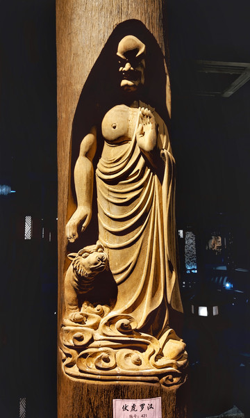 除了沉香宝塔外,展馆内还有不少沉香雕刻的佛像,包括18根沉香原木雕刻的18罗汉、形态各异的观音、笑容可掬的弥勒佛等。