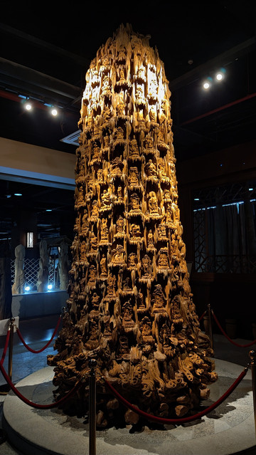 沉香宝塔:从沉香馆大门进去,左右两侧各有一个沉香木建成的八角亭,亭内各放一个高达4米的沉香宝塔。这两座沉香宝塔各有数百个用沉香雕刻的如来佛或其它佛像。雕工细腻,人物形象生动逼真,造型各异,足见雕刻师用心之细腻。