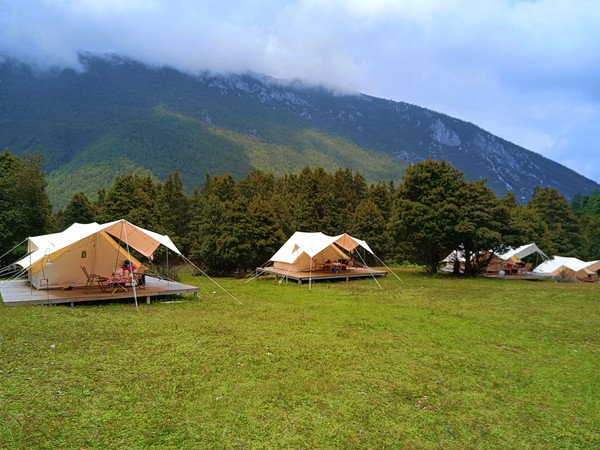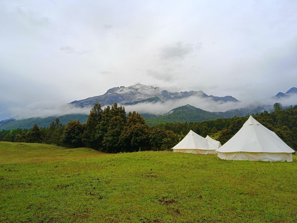 10号,半夜落雨,落到朝早先停,之后云雾散去,成个营地好似仙境甘,值回票价,仲见到哈巴雪山既顶峰添。