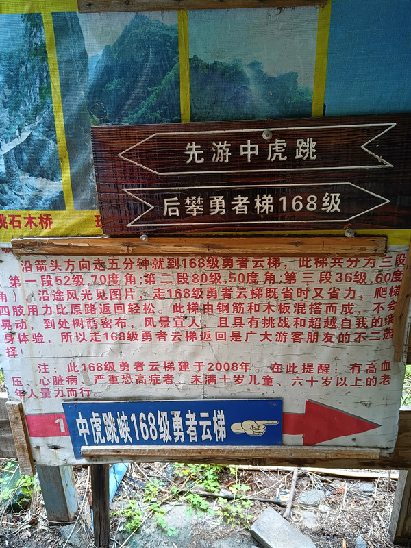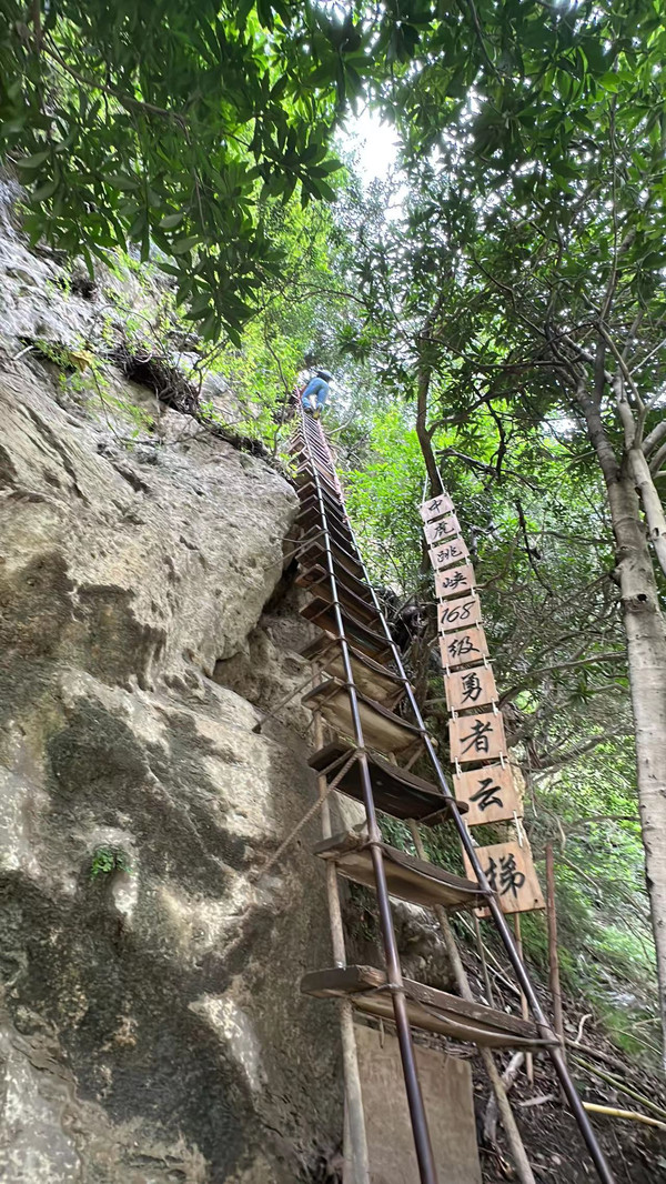 谷底有一小吊桥与“天梯线路”相通,过去要另外收钱。告知果边我地剩系过去佢地既吊桥就原路返回,所以只收五蚊位,过其吊桥去江中大石再收10元(19年春节过过一次,水量冇今次大,极力推荐,果年个仔仲未敢行,今次就唔同喇)。回程,爬168级勇士云梯上嚟(10元位,天梯既老板娘竟然系琴日系中途接我们返山美既司机),天梯好斜,,加上后段体力差,D后生仔留前斗后,经已唔见晒人影喇,好在两公婆互相鼓励、慢慢爬,一样上到嚟。呢段谷底徒步成个行程约5个钟(含大量影相时间),水平距离小,不过就落差好大,已经接近自己体能既极限。