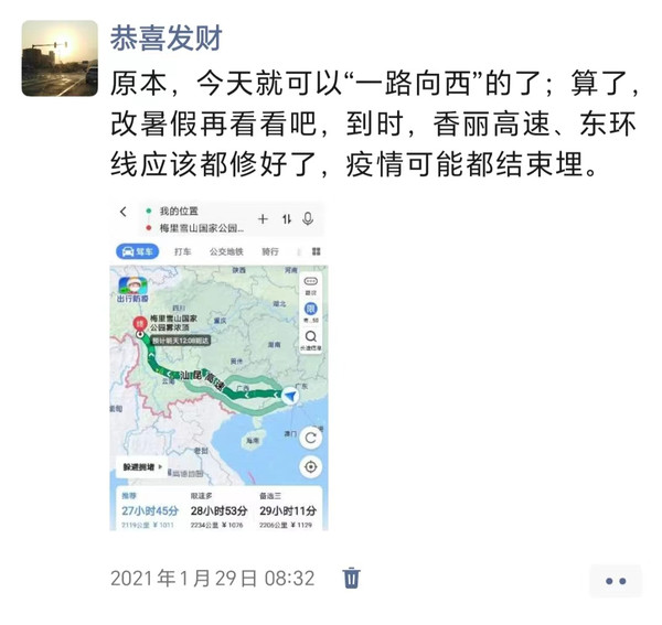 13号,按原计划,第二日系去千年盐井后就正式原路回程住飞来寺一晚既。十点,我地一家先行出发,无耐就变到好好天,车度放住个仔D劲歌,开系去尼农峡谷既路上(没有选择飞来寺方向,想去睇尼农峡谷既滑索同雨崩既出入口),D感觉凸然间上晒嚟。细恁左下,今日先至系星期日,仲有成个礼拜,点解唔去埋318遮?!一讲出嚟,老婆同仔都赞成,停落嚟睇睇个导航,一路畅通,即刻就甘愉快地决定啦(错过了8月14日的日照金山),果种可以甘突然改变既感觉好得人钟意。