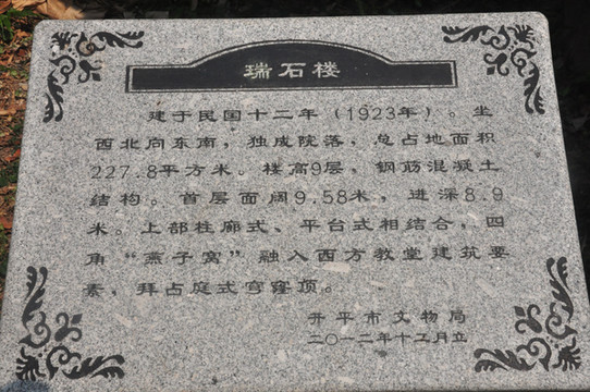 民国十二年至十四年(公元 1923-1925 年),在香港经营钱庄和药材生意致富的黄璧秀为保护家乡亲人的生命财产安全,回乡兴建了瑞石楼。瑞石楼位于锦江楼的东侧,坐落在村落民居的主轴线上,是典型的居楼式碉楼。瑞石楼是由黄璧秀在香港谋生、爱好建筑艺术的侄儿黄滋南设计的,施工者都是本村或附近的工匠,建楼所用的水泥、钢筋、玻璃、木材等均是经香港进口,总投资 3 万港元。该楼以黄璧秀的字号"瑞石"命名,"瑞石"就是美玉,即"璧"的意思。瑞石楼为钢筋混凝土结构,楼高 9 层 25 米。室内布置也受到西方生活的较大影响。第 1 层是客厅,第 2 至 6 层每层都配备设施齐全的厅房、卧室、卫生间、厨房和家具。第 6 层外部为柱廊,第 7 层为平台,平台四角各伸出一个了望、防卫用的圆形塔楼,南北面则以巴罗克风格的山花和中国园林景窗相结合,第 8 层内部放置祖先神龛,该神龛雕刻精美,堪称艺术精品,为家人祭祖的精神空间所在,室外则是一周观景平台,第 9 层是堡垒式的了望塔,整体建筑呈现出中世纪意大利城堡风格。瑞石楼在立面上运用西洋式窗楣线脚、柱廊造型,大量的灰塑图案中,融入了中国传统的福、禄、喜、寿等内容,在西洋的外表下蕴涵着浓郁的传统文化气息。楼内家具形式与陈设表现出十足的传统格调,酸枝木的几案、椅凳、床柜,柚木的屏风,坤甸木的楼梯、窗户等,用材讲究,做工精致,格调高雅。特别是用篆、隶、行、草、楷等多种中国书法刻写的屏联,更具中国传统风韵。瑞石楼有"开平第一楼"的美誉。