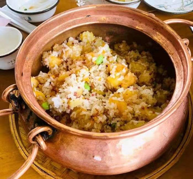 小锅饭配料实足,里面有店家特色的东巴烤肉和土豆球。
