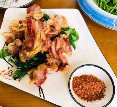 东巴烤肉的肉是肥瘦相间的薄片烤的,口感酥脆。