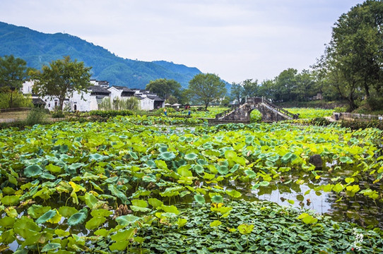 目力所及,荷叶层层叠叠,绿浪涌动。无边的绿意里,隐着一片片鱼鳞瓦顶,一面面灰白粉墙。远处黛色山峦次递铺开,仿佛隔世的屏障,守着这个桃源般的小村落。