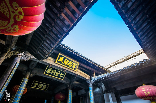 从祠堂院中一角向空中望去,高低错落的屋檐搭出美丽的画框,微蓝的天空中泛着浅白,站在院中的人犹如欣赏着一幅自然天成的画。