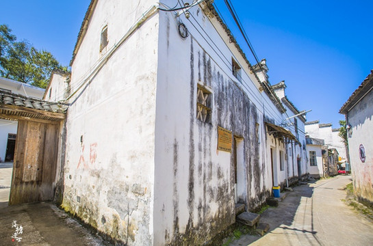 狭窄路面宛如戴望舒笔下的“雨巷”。街两旁散布着典型的徽州民居。偶尔新绿的草木贴着老旧的墙面,打破了白灰色的沉静,阳光肆意涂抹在飞檐上墙壁上,仿佛一部老电影的长镜头。