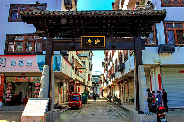 深渡,位于歙县东部,形成于唐,兴建于宋,是古徽州通往浙江的水上咽喉,重要的物资集散地。深渡老街曾以幽深闻名,以古巷纵横为奇,曾有各类店铺180余家。新安江水电站大坝建成蓄水后,深渡老街大部处在淹没区以下,外街、中街、横街拆迁,里街因地势高而幸存。2018年,深渡老街按照修旧如旧的原则进行了维修保护。牌楼下面的铭牌是这样介绍的:“深渡老街曾被称为“皖浙街”,因水淹没,仅存这条老街(里街),长约200米、宽1米,成为国家传统村落。”