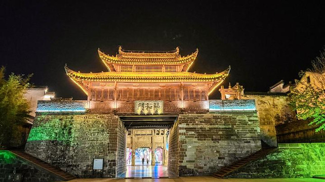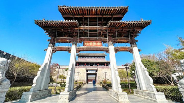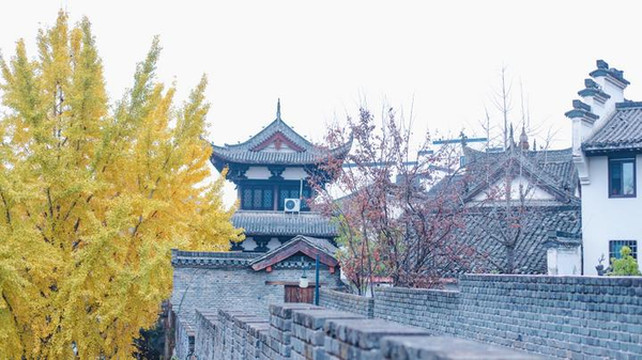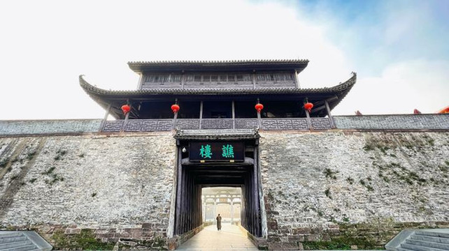 徽州古城始建于秦朝,自唐代以来,一直是徽郡、州、府治所在地,故县治与府治同在一座城内,形成了城套城的独特风格。从停车场进入古城,首先出现在我们眼前的便是南谯楼,始建于隋末,是古代夜间向人们报时的地方,打更的鼓声就是从谯楼传向四面八方。南谯楼连着古城墙,三重三开间,高约20米,宽约15米,进深约10米,砖木结构,悬山顶,重檐高脊,紫墙青瓦。下为门厥,左右各有木柱13根,每根柱围1米余多,每柱均呈10度左右斜倚墙壁,用以支撑大梁。