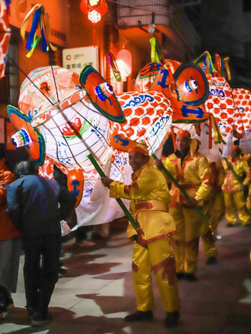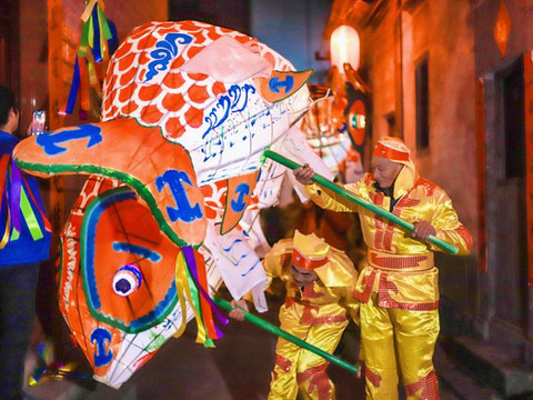 鱼灯是从宋代沿袭至今的民俗之一,农历正月初八时,各村各组亲手制作的超大红鲤鱼鱼灯,在瞻淇的巷弄里,轻摆身躯或前俯后仰跌荡起伏旋圈子,一般大红鲤鱼每到一户人家,都会放慢脚步,踩踏着鞭炮的纷屑起舞腾跃,伴着热烈的鼓声把幸福吉祥送入各家,非常喜庆年味十足。