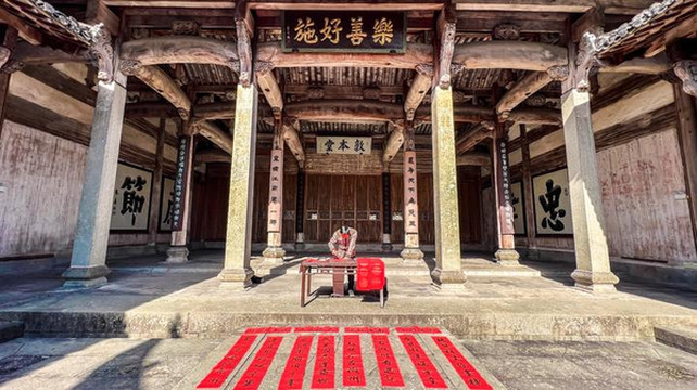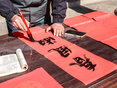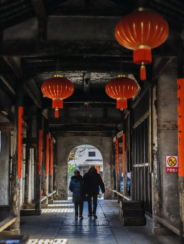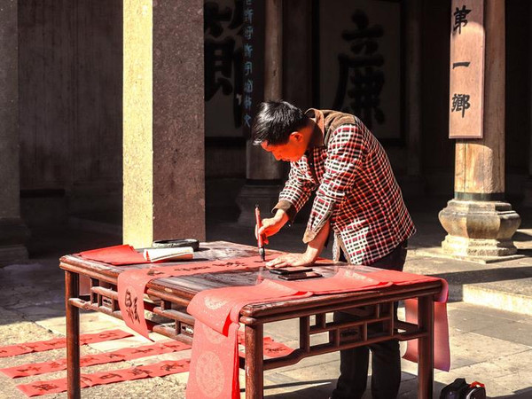 走进棠樾村口,七座牌坊、一座古亭、一座祠堂就在我们眼前,临近春节,棠樾的节庆气氛已经开始,书法家协会的会长亲自在这里持笔写春联,徽墨在侧,只见他行云流水一般的挥墨,一张张红纸上留下一个个新春的祝福。会长说每年春节前他们都会在这里写春联,几百几千幅的写,这不仅仅是他们的乐趣,更渐渐成为了这里的民俗,成为了棠樾专有的文化。