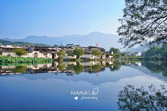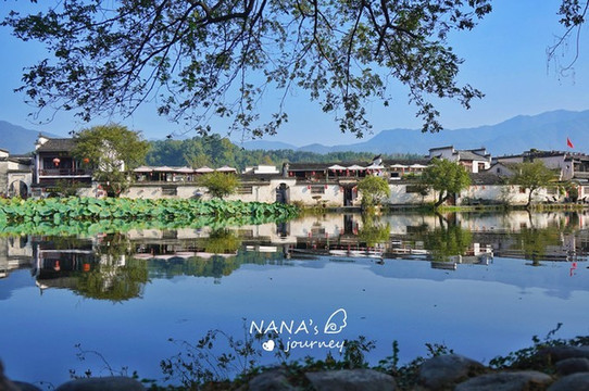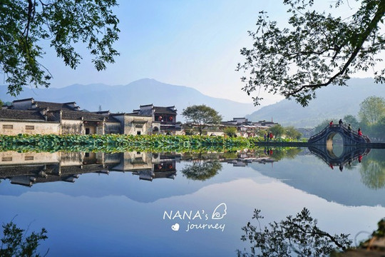 清早,踏着清爽的晨光,我们来到了宏村,从西门进入步行一会,便是南湖美景。宏村南湖最出名的就是这平静如镜的湖面,倒影了整个宏村的景色,而背景的山峦,此岸的树木,框起了一幅“山水村落美景”,不负其盛名。