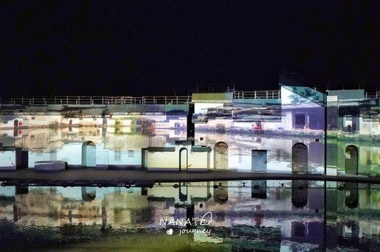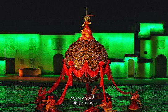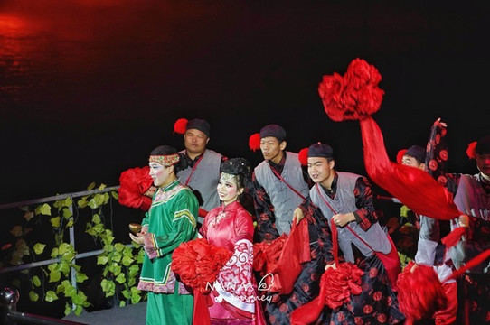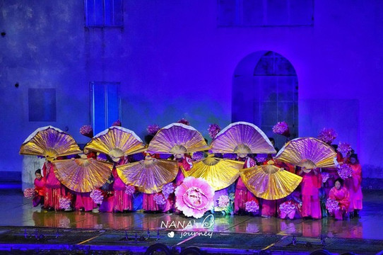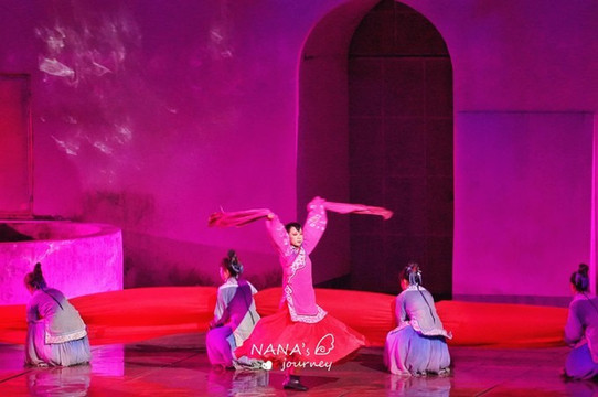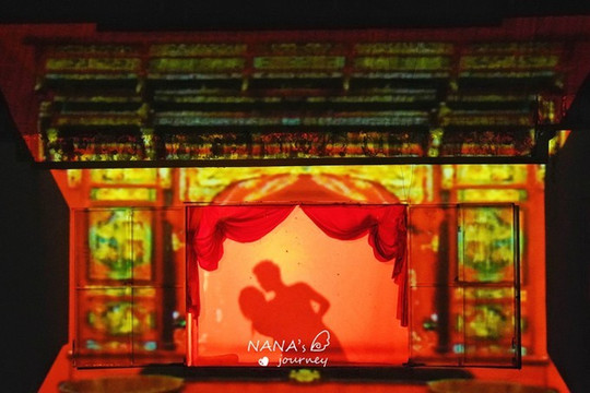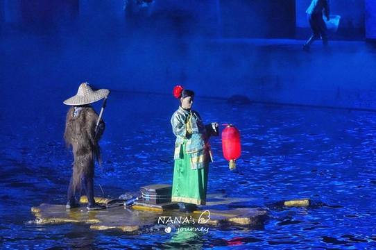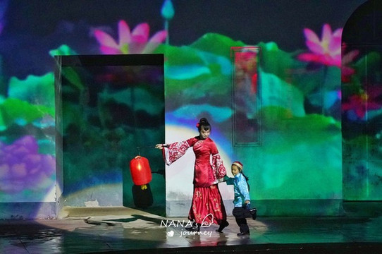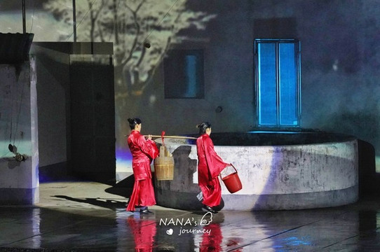 刚一入场,舞台的背景便是宏村的招牌景色,印刻在建筑上,配合上舞台的水池,仿佛眼见的身处的都是宏村之内。