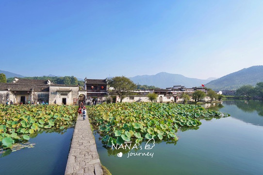 走过南湖中间的石板路和拱桥,我们正式进入了宏村,这里还有一大片的荷花相伴,只不过秋天过了季节没有了荷花,但绿意葱葱的还是充满着活力。