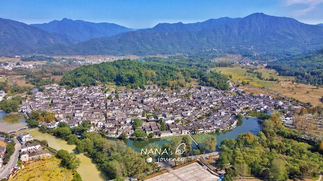 最后,飞了无人机上天看看宏村的全貌,牛形是不是更加明显了呢~宏村背靠高山的山脚下,依着大片水源,风水宝地大概就是这个意思吧。