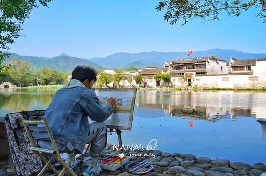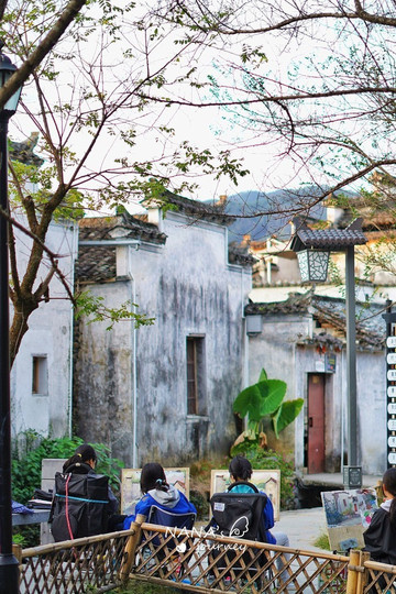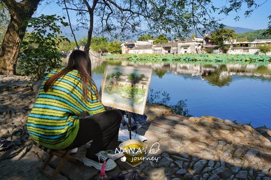 绕回南 湖南 岸的时候,写生的学生们都已经来了,一幅生机勃勃的景色,他们笔下慢慢地绘出了 徽州 古村落的水墨感。