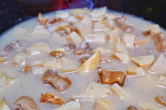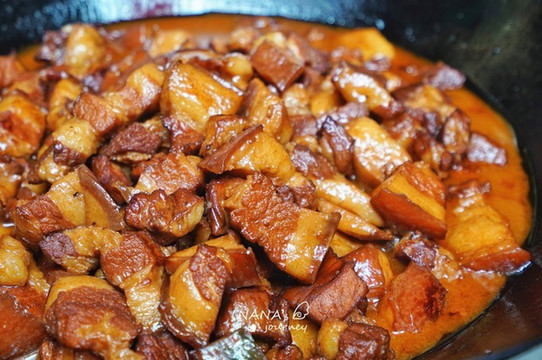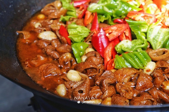 厅里放着几个锅子,猪的各个部分已经安排上了,看着就色香味俱全,太想吃了。肥肠、红烧肉、竹笋烤肉、小排,已经让宾客大流口水了。