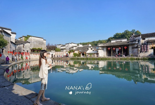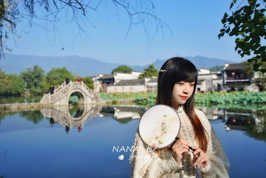 一直渴望用镜头记录下整面月沼倒影,这次终于圆满了,而我也能站在池畔,静看 徽州 古村之美。温婉的格调,是最适合古村落的风情,执扇静观,是品味宏村正确的打开方式。