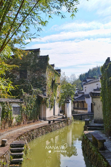 河道都是简约的石板为桥,抬头是爬山虎和马头墙的交相融合,岁月的痕迹,处处可见,指引着方向,带你去探索。