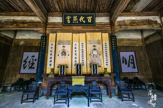 在 徽州 有三绝:民居、祠堂和牌坊,宏村这一座祠堂却很独特,它的总建筑师是一位女子。祠堂正厅叫叙乐堂,正前方供奉着汪氏家族的老祖宗,在这三幅画像的左边,是汪氏宗祠的总建筑师胡重,她不仅主持修建了汪氏宗祠,还策划了宏村的水系,比同辈宗族的男人对宏村贡献都大。堂屋内格局宽敞大气, 隐约透着曾经大户人家的富绰。