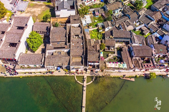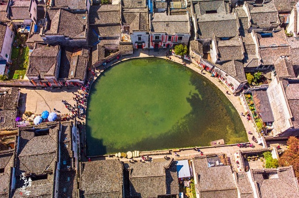 宏村的中央是月沼,这里也是游客聚集的中心区域。俯览月沼,一池碧水仿佛一块玛瑙点缀在村子中,水是春天的符号,春水渐绿时,春天就醒了。