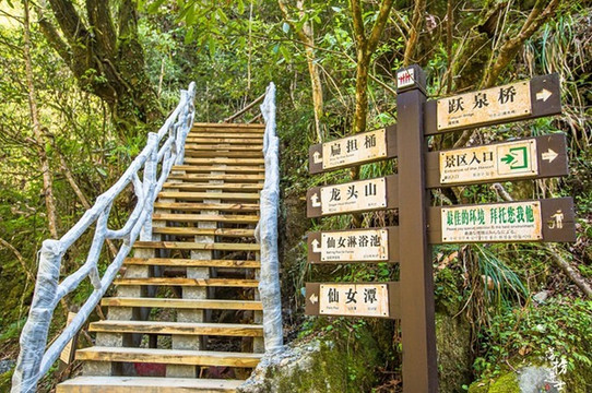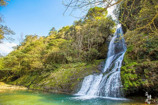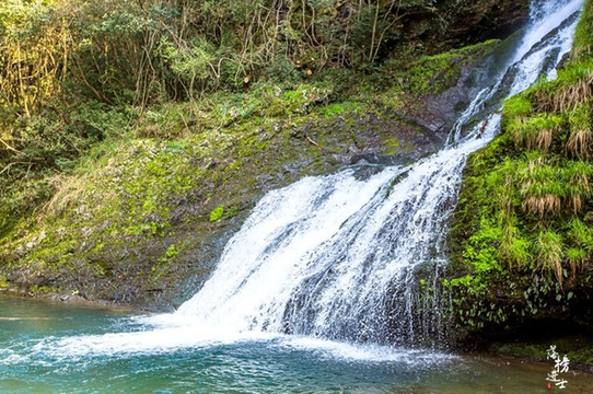三叠瀑是景区内最出名的景点。三叠,顾名思义,三段瀑布自山上倾泻而下,形成三个深潭,最高处的瀑布最具动感,潭水也最清澈明亮。中间的瀑布水势见缓,潭水幽柔深邃,让人心生宁静。最后一叠瀑布隐约透着温柔羞涩,潭水则最开阔,站在谭边,能感觉到它的亲近。