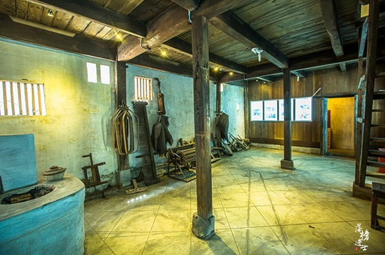 《菊豆》中的老杨家染坊位于南屏村叶氏宗祠。当年《菊豆》的拍摄这里也保留了电影中的一些痕迹,进入大门内54根硕大挺拔的木柱映于眼前,“西州声教流岚谷、南国簪缨嗣 石林 ”等充满了寓意的木制对联还挂在上边。接着向前走,染池、染布、台架、挂车等熟悉的元素悉数出现,电影中的悲怆又多了一分,菊豆和杨天青窒息般残酷和压抑的爱情就是在这里诞生。看着眼前高高悬挂的染布,仿佛正是束缚俩人情感的牢笼,可恨却又无奈。