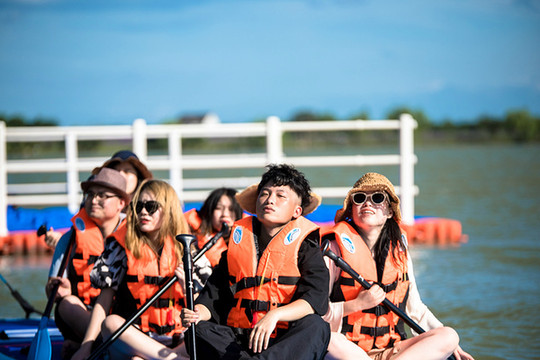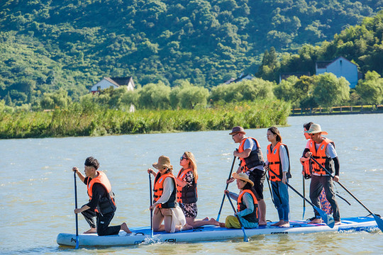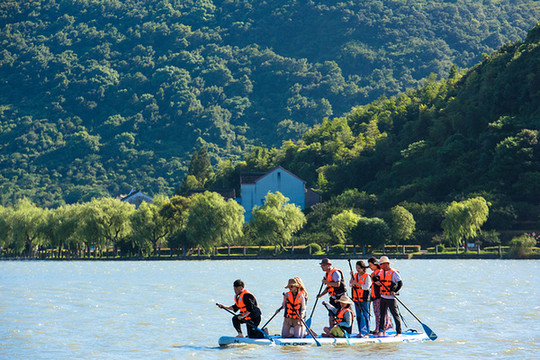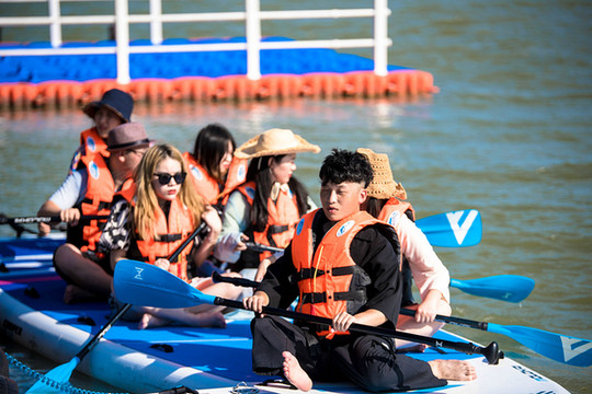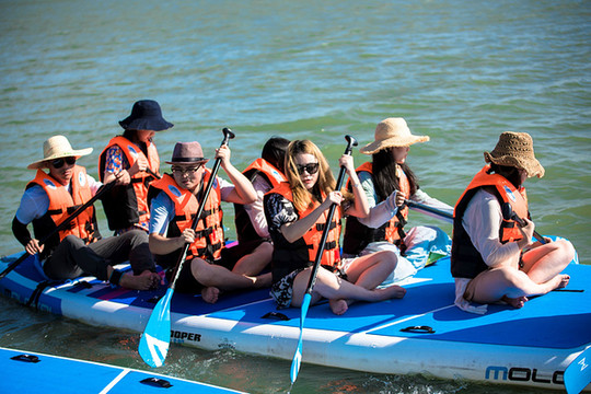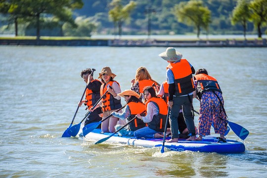 湖上有很多支浆板,彼此间可以比赛,可以嬉闹,“橙子”们调整好状态便开始寻找对手,想痛痛快快分个胜负。大伙儿玩得热火朝天,兴致盎然,身上的汗水和溅起的水花早已分不清什么是什么。从浆板上下来,大伙儿脱掉亮橙色救生服,卸到只剩一身轻松,便相约着一同聚餐。