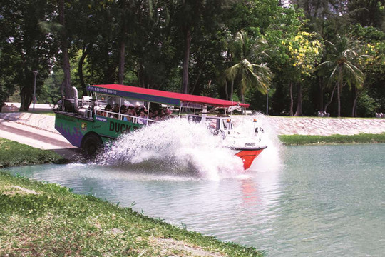 新加坡鸭子船是由二战时期的越南战车为原型模型改造而成,既可以在马路上行驶,又能在水上航行,是非常有特色的新加坡观光交通工具。