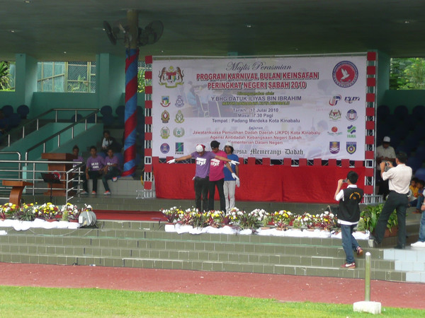 逛完周末市场,我们去了独立广场。广场正在举办纪念亚庇市成立10周年演出活动,城市的治安、消防、医疗、教育、市政等部门都在这里设立了摊点,提供咨询服务。