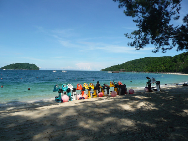 酒店的车先把我们三人送到城市西部的码头,这里是个私人游艇码头,港里停满漂亮的游艇。导游陪我们三人乘坐专艇前往曼奴干岛。东姑阿都拉曼国家公园由五座小岛组成,曼奴干岛最大。船十几分钟就到了岛上,东岸北部的海岸坡度比较深,海里有大片珊瑚,只需游出几米就是大面积的珊瑚区,可以看到成群的漂亮的热带鱼。驻足岸边海水清澈见底,五颜六色的珊瑚若隐若现,各种各样的热带鱼游来游去,许多未曾见过的鱼群与你擦身而过。海边还有很多座椅,供游人休息、野餐、看海。