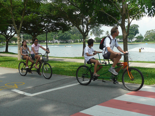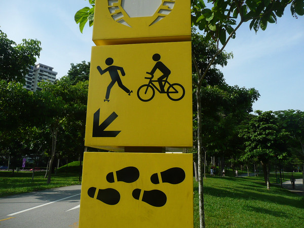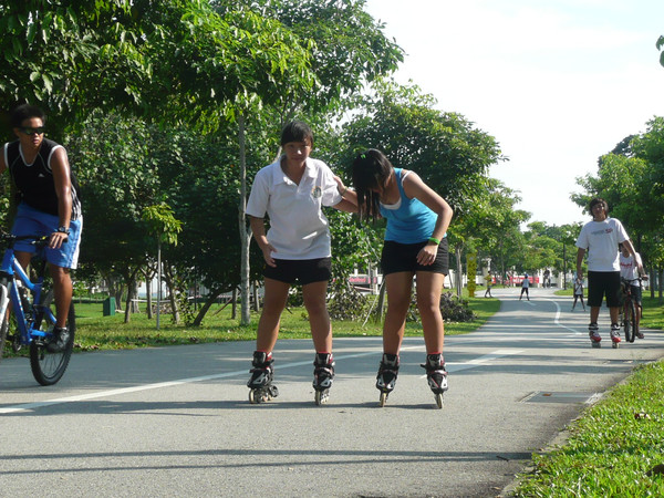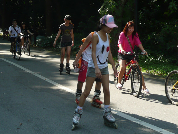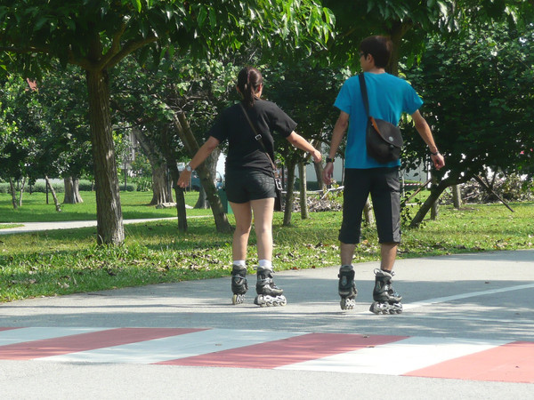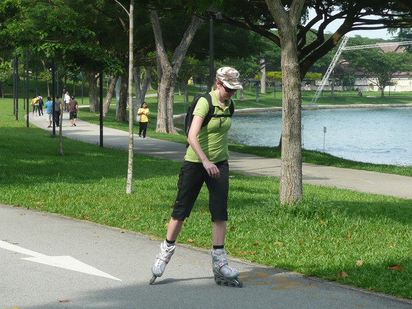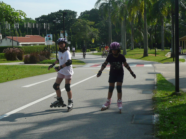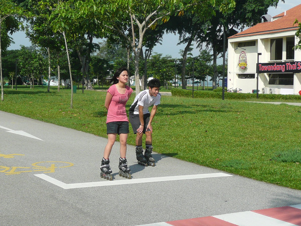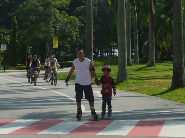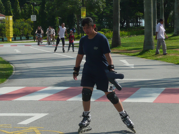 上午先去总统府,然后去市政厅、鱼尾狮看了看,主要项目是东岸公园。到东海岸公园,在地铁勿洛(Bedok)站(EW5)下,换401路公交(只是周末、节日有车)。这里环境非常美,一边是美丽的海滩,一边是椰林绿地,有专用的自行车轮滑道,还有专用的步行道。很多人在这里跑步、骑车、轮滑。这里离樟宜机场很近,有机会可以专程来轮滑。