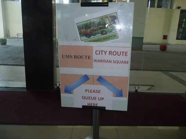 出机场大厅右转,最右侧的门口有一排椅子,那里就是16A汽车站,没有站牌,没有任何标志,问了坐在椅子上的两个欧洲游客,确认无误,等就是了。16A也不知道多长时间来一趟,等车时间正好研究一下亚庇地图(机场内免费索取)。等了半小时,车来了,很小很旧的中巴,比起槟城和吉隆坡的公交车差远了。16A是环行车,沿途经过美丽的First Beach, 亚庇市最美丽的丹容亚路海滩(Tanjung Aru Beach),最后到达亚庇市西部的公交总站。车费1马币。