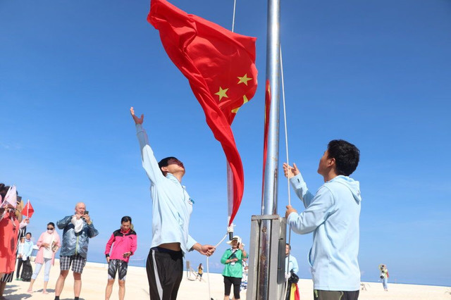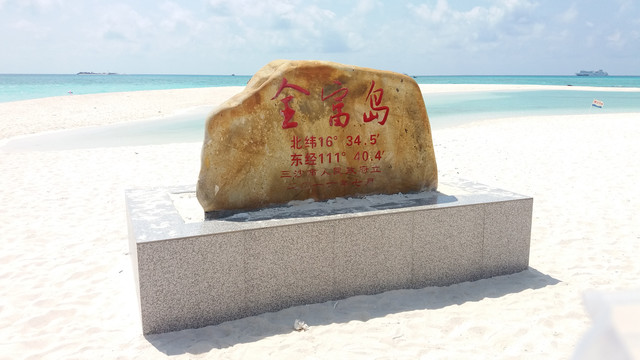 集合的时候走过全富岛的主权碑,阳光照耀下的主权碑闪着金光,神圣又庄严。全岛没有建筑,惟有这块碑分外耀眼,离碑不远的岛中心处,便是国旗杆,我们全体人员集合完毕,准备升旗,有人问管家有带音响么?管家淡淡的回了句:有中国人在的地方,升旗不需要音响。的确,我们每一个登岛的人都是音响,管家的一声令下后,国旗在我们齐声高唱的国歌声中,缓缓升起,大家群情激昂,越唱音浪越高,最终在音浪声中,将国旗送上了最顶端。