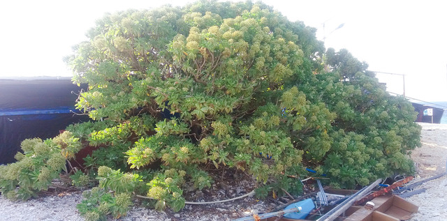 岛上的植物多为耐盐碱的灌木,比如这颗巨大的草海桐(也叫羊角树),这种树叶子硕大、根系发达,并且耐盐性强,喜欢高温、温暖和阳光充足的环境,生长速度快,是典型的滨海植物和海岛固沙防潮的首选树种。