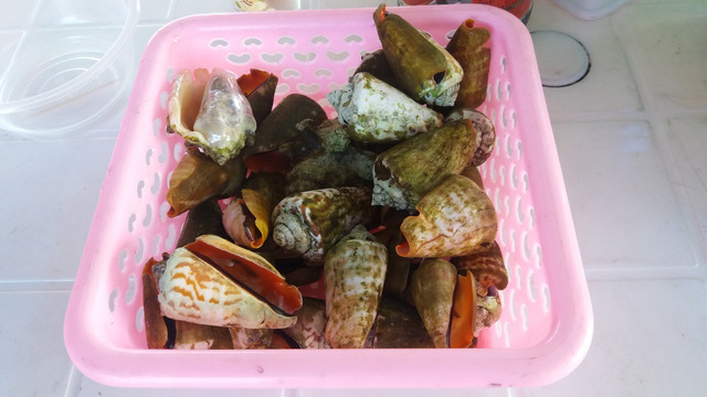 很快,我们点的海鲜上桌了,第一道是西沙最常见的红口螺。所谓靠海吃海,海螺也是岛上最常见的海鲜,用海水一煮开就可以吃,什么作料都不用放,连盐都免了,可谓是真正的原汁原味。不过螺肉一煮就会缩进壳里,吃螺要会把螺肉挑出,我们技术水平一般,往往需要牙签帮助,而挑出来的螺肉富含蛋白质,入口嚼劲十足,口感劲道,嚼完还会有一股甜味在里面回味无穷。听管家说,我们的长乐公主号在抵达锚地后往往会特意找渔民收购他们捕获的各种螺给我们做晚餐。看来发展旅游对这里的贡献不小。