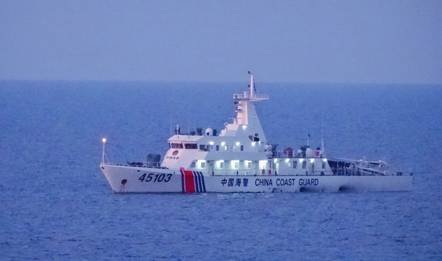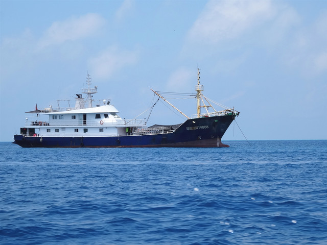 还有黄昏的光线中为渔船保驾护航也是海域日常巡视守护者的中国海警船。