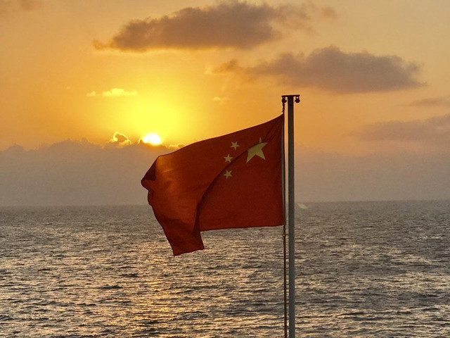 可时光总是不让人多看,很快夕阳飞速向海平面坠去,霞光下的国旗,美得不可方物。
