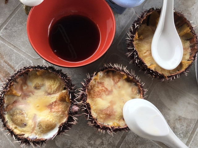 我们的另一道菜是海胆蒸蛋。这是我第一次吃海胆,在这里,新鲜海胆最美味的吃法就是做成这样的海胆蒸蛋,海胆本身的营养价值就很高,配合上鸡蛋的清香,入口清香美味也非常滋补。不过边吃边跟渔民聊才知道,海胆易得,其做配料的鸡蛋可就不像我们内地那么容易获取了,他们每近一次鸡蛋,往往要通过补给船从海南运转两次,先到永兴、再来这里,长途跋涉才能送到,且海浪颠簸,鸡蛋每次运输非常易碎,到手时往往不能完整,听完他的描述,不由感叹我们能在远离祖国的西沙鸭公岛,吃到这样美味的海胆蒸蛋,真是非常不容易。