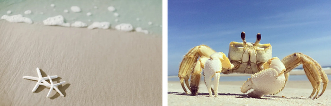 沿着白色的沙滩寻找贝壳、螃蟹
