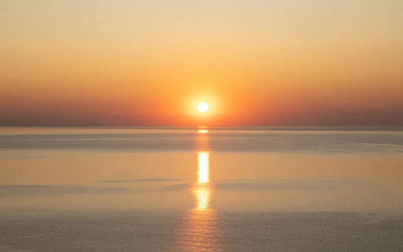 一夜美梦,天色渐亮。天气好的日子,可以观看日出升起的整个过程。太阳慢慢地爬升,海面波光粼粼,似昨夜的星空坠入海里,欢快地跳跃。等到太阳完全跃出海平面,天空和大海都布满了耀眼的光芒。