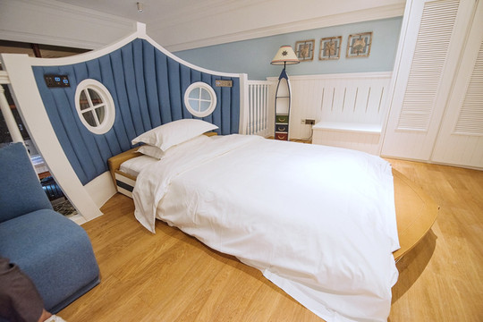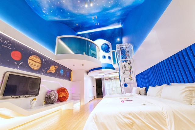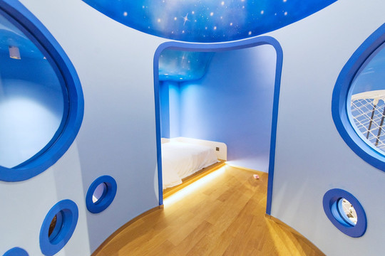星空房以蓝白色调为主,梦幻浪漫,有一种遨游太空的未来感。
