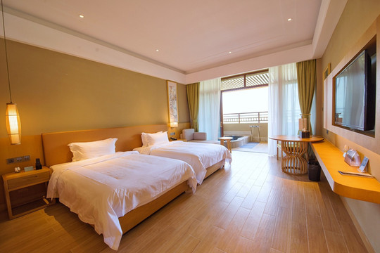 我们当时入住的是57平以上的湖景豪华双床房,全景落地大窗,迷人的山景一览无余。室内装饰简洁大方 ,原木风格颇有家的温馨。