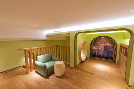 森林房的整体色调以绿色为主,墙壁上的动物绘画给房内增添了不少乐趣,像闯进童话一般。