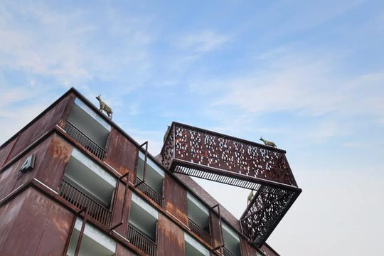墙上画着特别吸引人的红色主义涂鸦,铁艺和红砖体现了强烈的时代感,外墙红色彩绘切合1978电影小镇的主题。