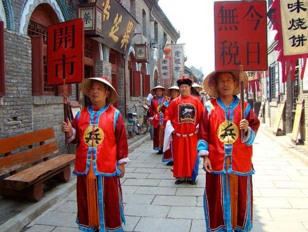 突然,一阵不紧不慢的敲锣声伴随着“开市”的吆喝,从街巷中,由远而近地传过来。只见几位身着清兵服饰的老者,举着“开市”、“今日无税”的招牌走过来。游客们兴奋好奇地注视着这项古街礼仪活动的进行。不少孩童尾随着鸣锣开道的“清兵”身后玩耍,好一幅生动有趣的市井图画。