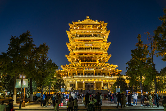 灯光映衬下的海岱楼,宛如一颗宝石镶嵌在城市中。当夜幕降临时,楼下群众准备上演古乐演奏,她们身着汉服,让你仿佛穿越回了古代。