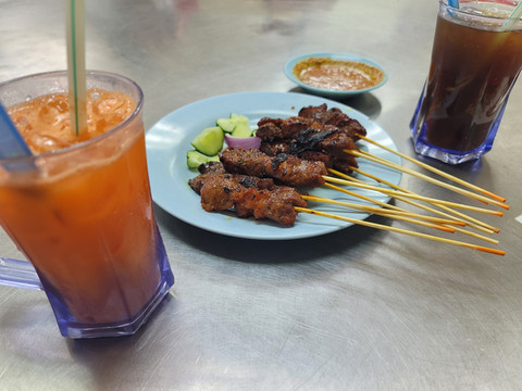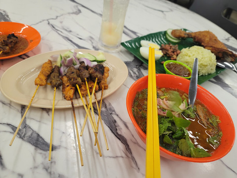 之后去Chulia Street Night Hawker Stalls,这个露天夜市就充满了人间的烟火气,一张空桌子都难以找到,而且油烟味太大太浓烈,我们只能无奈错过。最后到The Jetty Food Court,这里明显有更多的食客和本地居民,尝试了亚参叻沙,不同于咖哩叻沙,这款没有肉类配料,主要的味道来源于用鱼肉熬制的汤头和最后加的一勺虾膏。沙爹串配的沙爹酱很多很美味,不过肉串感觉不是现烤,热度不足,羊肉串比较好吃,有羊肉的脂肪。椰浆饭,饭中的椰浆味比较突出,炸鸡腿也做得火候正好,里面的肉不会过火,不过小鱼就太干了。这里的新鲜椰子也很划算,清甜多水,椰肉也香甜可口。