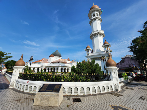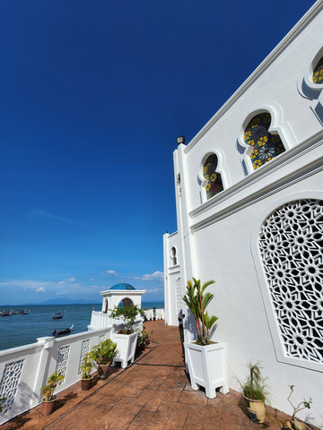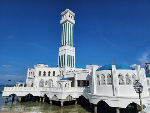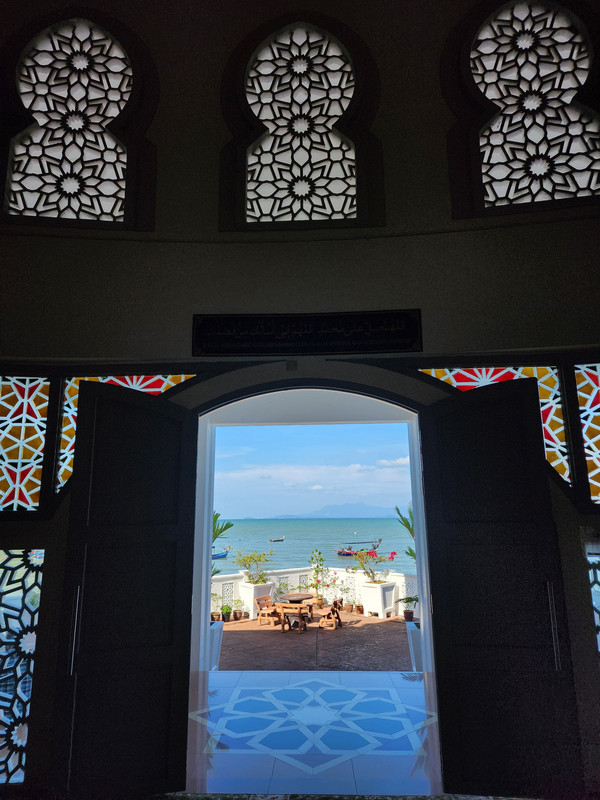 最后我们前往Masjid Daerah Timur Laut (Masjid Terapung),这是一座建在海边的清真寺,有着蓝色的圆顶,宛如漂浮在水上,门口的保安主动提供长袍给女士,让她们可以入内参观。